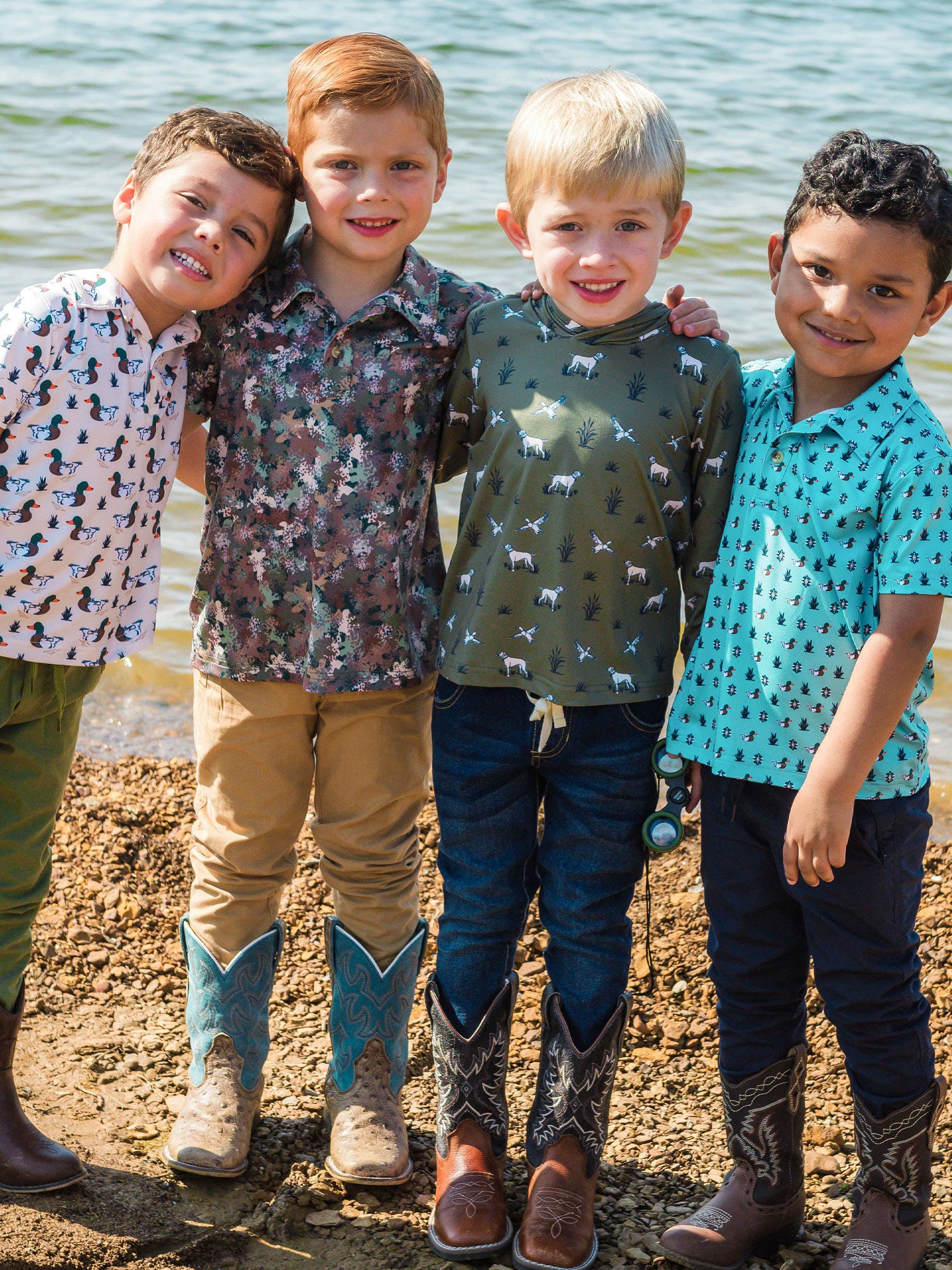 Ducks take flight and hunter dogs stand alert in a dark green marsh. A fun, lively print perfect for boys who love outdoor adventures and a bit of wild fun! Pairs well with Sea Spray, Dusty Olive, Oatmeal, Khaki, Dark Navy, Ivory.